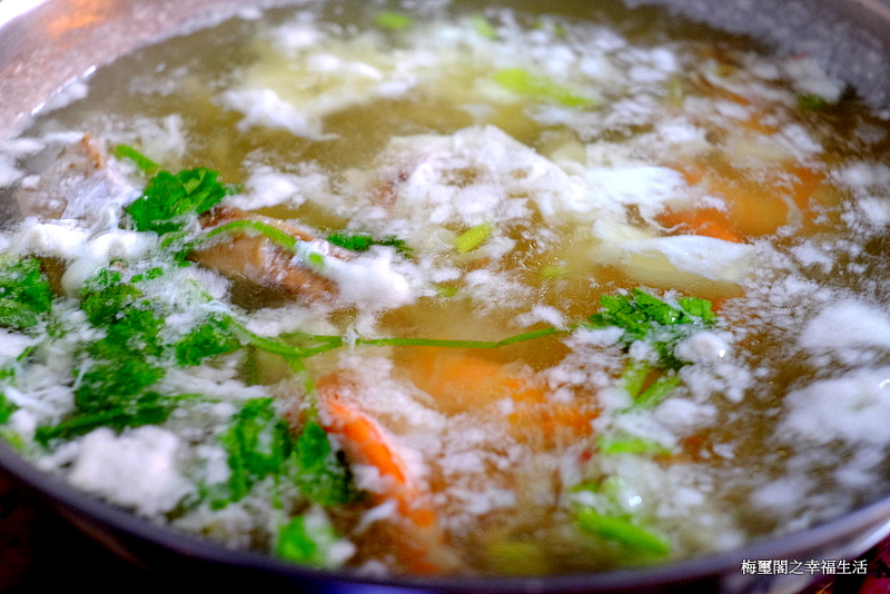 湯底,漂着幾片香葉香菜,有挺濃的柴魚片的味甜,很甜,甜到我懷疑是加了糖了。水燒得滾滾的,打入蛋清,把蛋黃蛋清分開,我可太拿手了,調好沙嗲。先下蝦吧,服務員說是送的,五隻。好新鮮的蝦呀,新鮮的蝦殼不好剝,所以現在蘇州「拆蝦仁」都是把蝦凍一凍再剝的,那些什麼「活剝河蝦仁」就是騙洋盤的。蝦肉脆而又甜,本以為送的是不值錢的基圍蝦,沒想到居然是臺灣草蝦,在臺灣,當然要喫臺灣草蝦,要知道,臺灣草蝦在上海,死的也要賣到六十一斤。