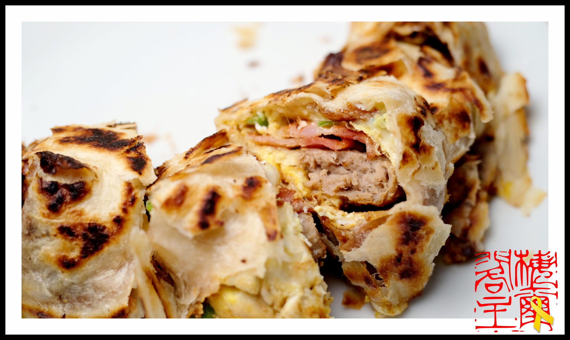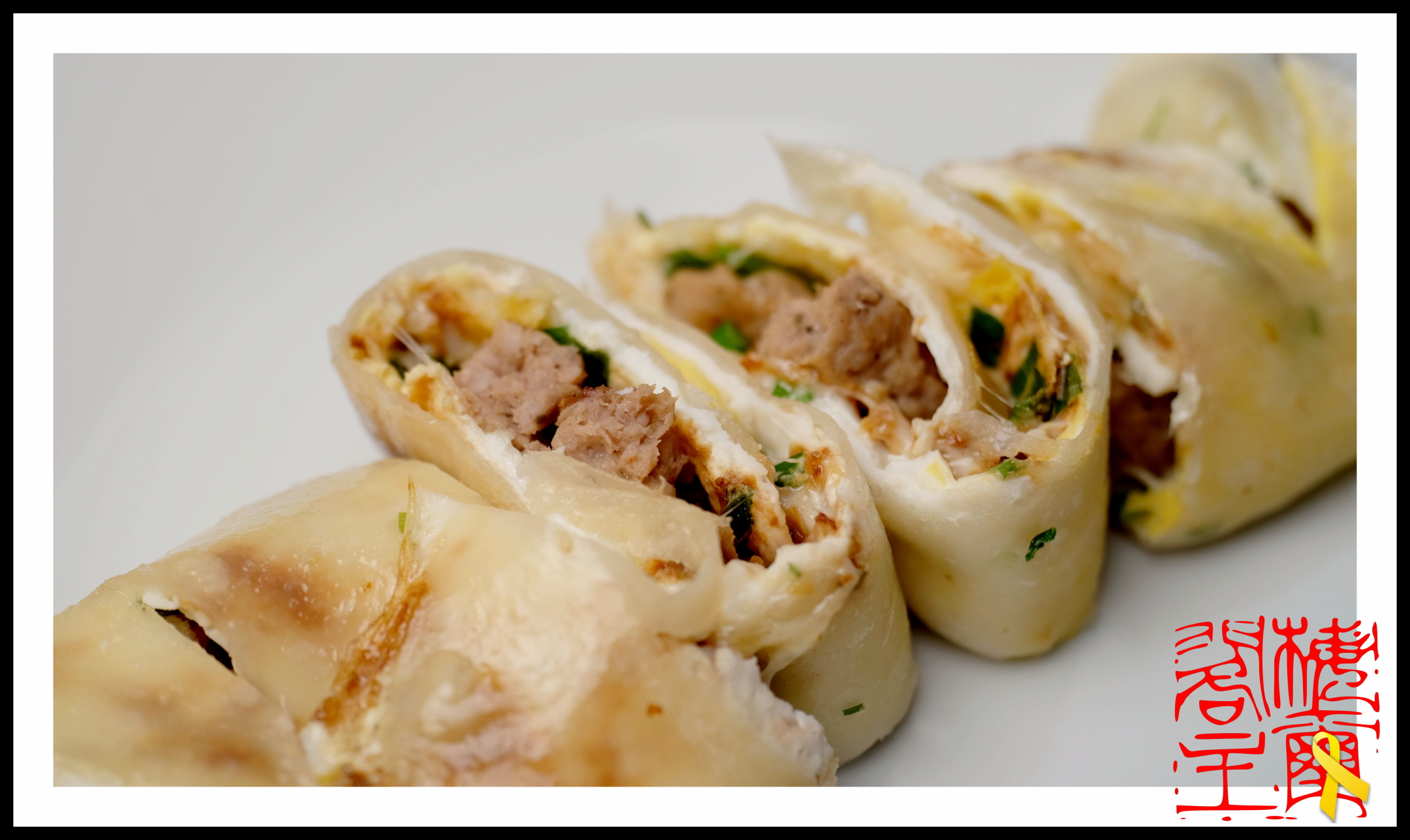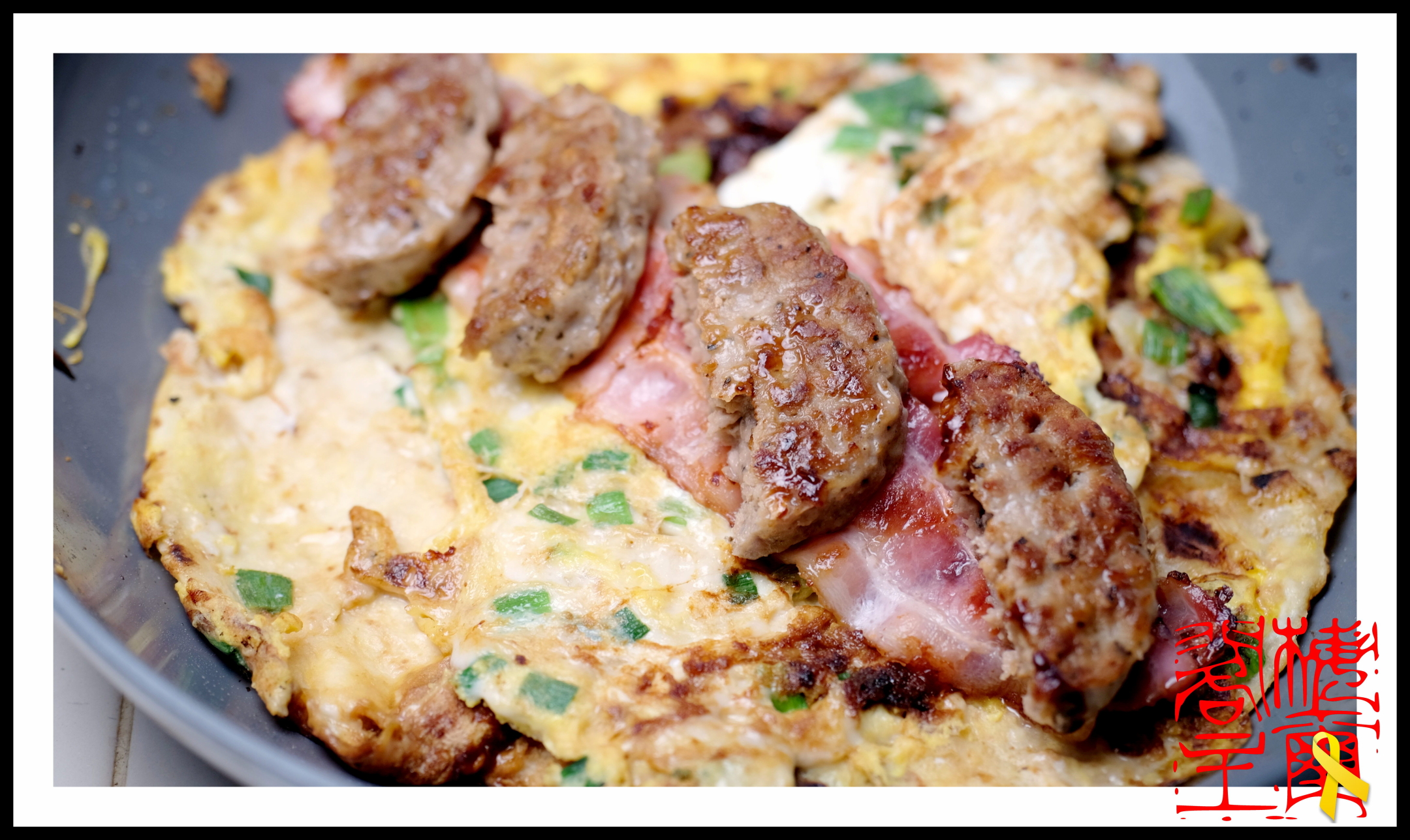 11月9日,早飯:自製蛋餅-Trader Joe’s flour tortilla, 雞蛋 x2,Kirkland Signature Low-Sodium Bacon 半條 x4,Mozzarella,Jimmy Dean® All Natural Fully Cooked Pork Sausage Patties x3, 甜麵醬,蔥花