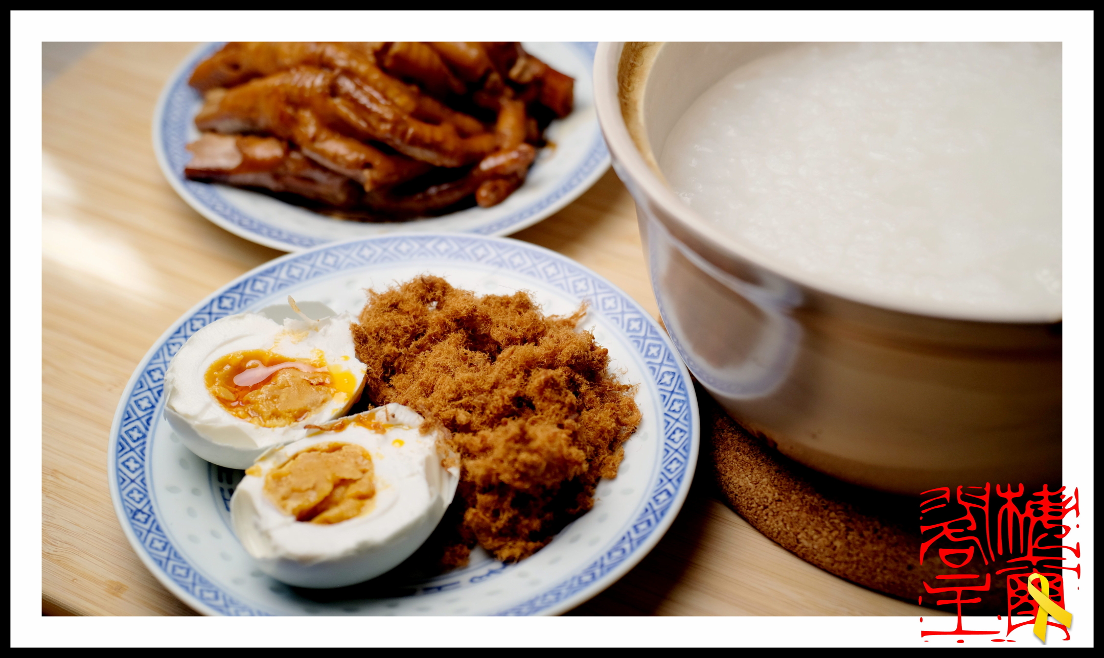 11月9日,中飯:白粥,COSTCO買的Xuri Egg Cooked Salted Duck Egg(旭日熟鹹鴨蛋)一枚,東之味肉酥(肉鬆),虎皮鳳爪,HAIO(Haioreum) Frozen Cooked Kimchi Flavored Vegetable Dumpling|H Mart自有品牌泡菜饅都 六都