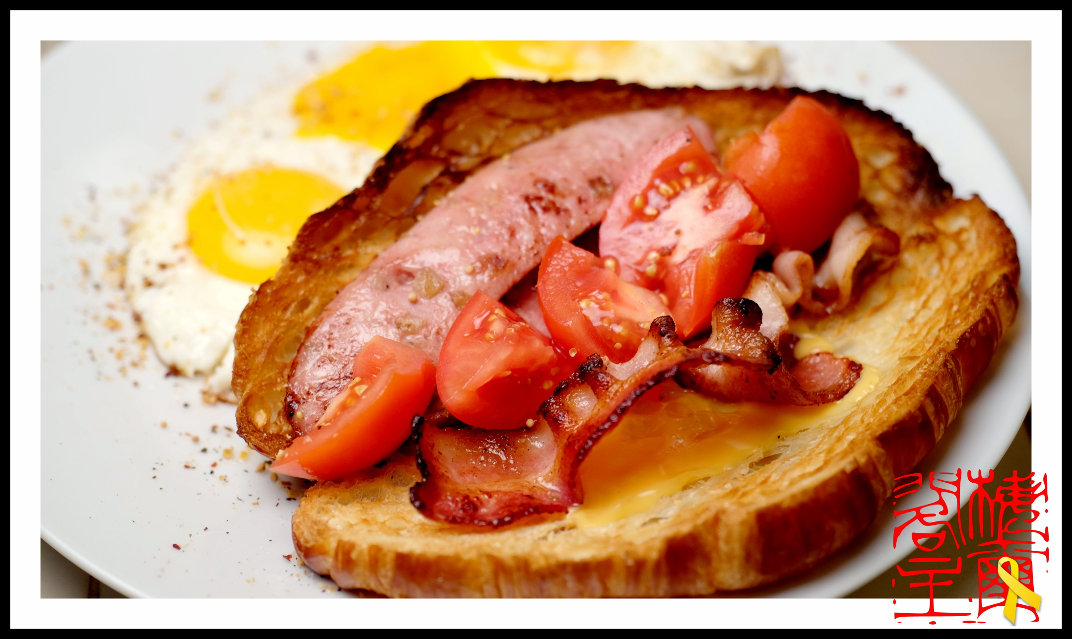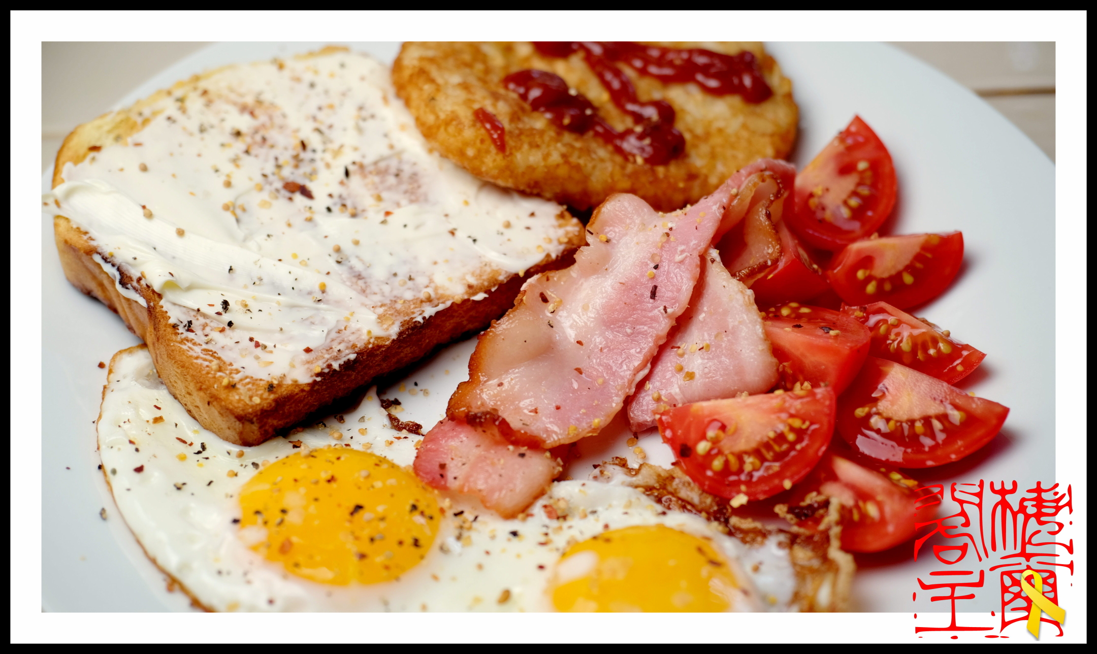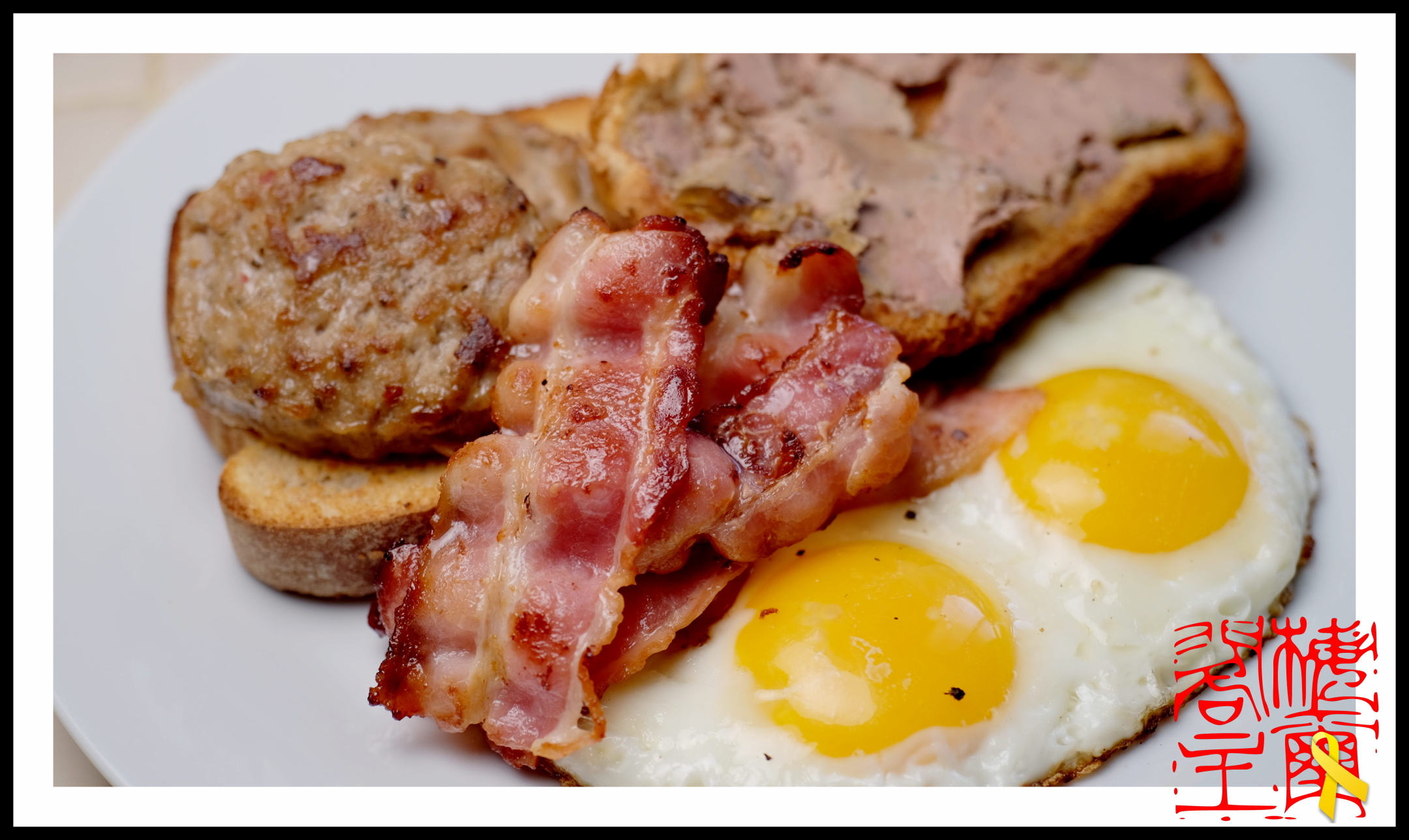 11月10日,早飯:煎蛋二枚,Alfaro’s Artesano Golden Wheat Bakery Bread 麵包二片,一片塗了Trader Joe’s Truffle Mousse Pate 肝醬,Kirkland Signature Low-Sodium Bacon 半片培根四枚,Jimmy Dean® All Natural Fully Cooked Pork Sausage Patties 肉餅二枚