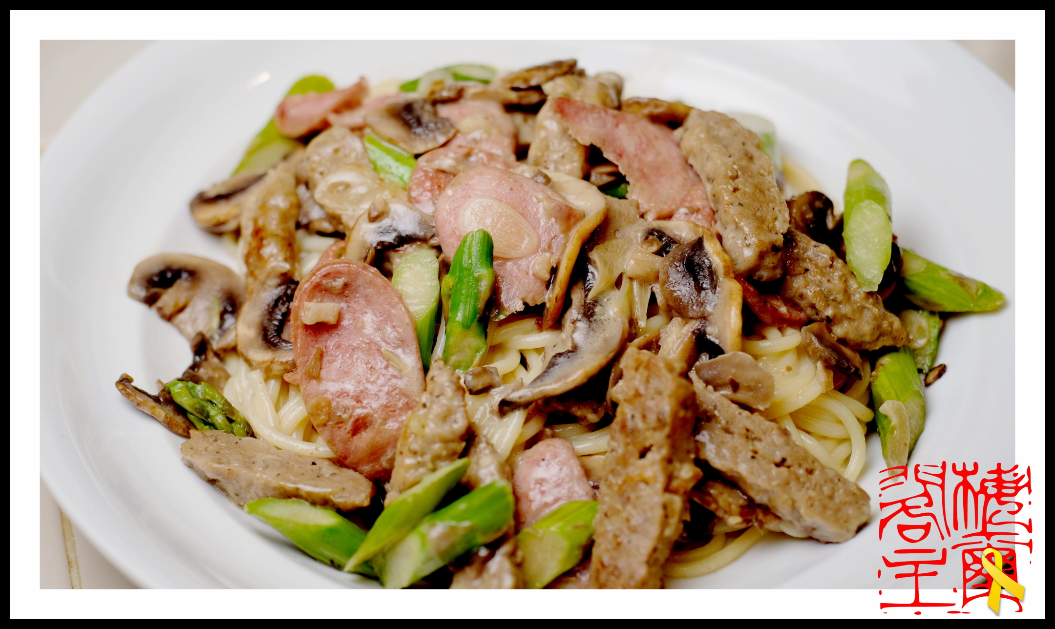 11月10日,夜飯:義麵-蘆筍、蘑菇、aidells Chicken & Apple Smoked Chicken Sausage、Garofalo Organic Spaghetti Noodles、Jimmy Dean® All Natural Fully Cooked Pork Sausage Patties、Kraft Singles American Cheese