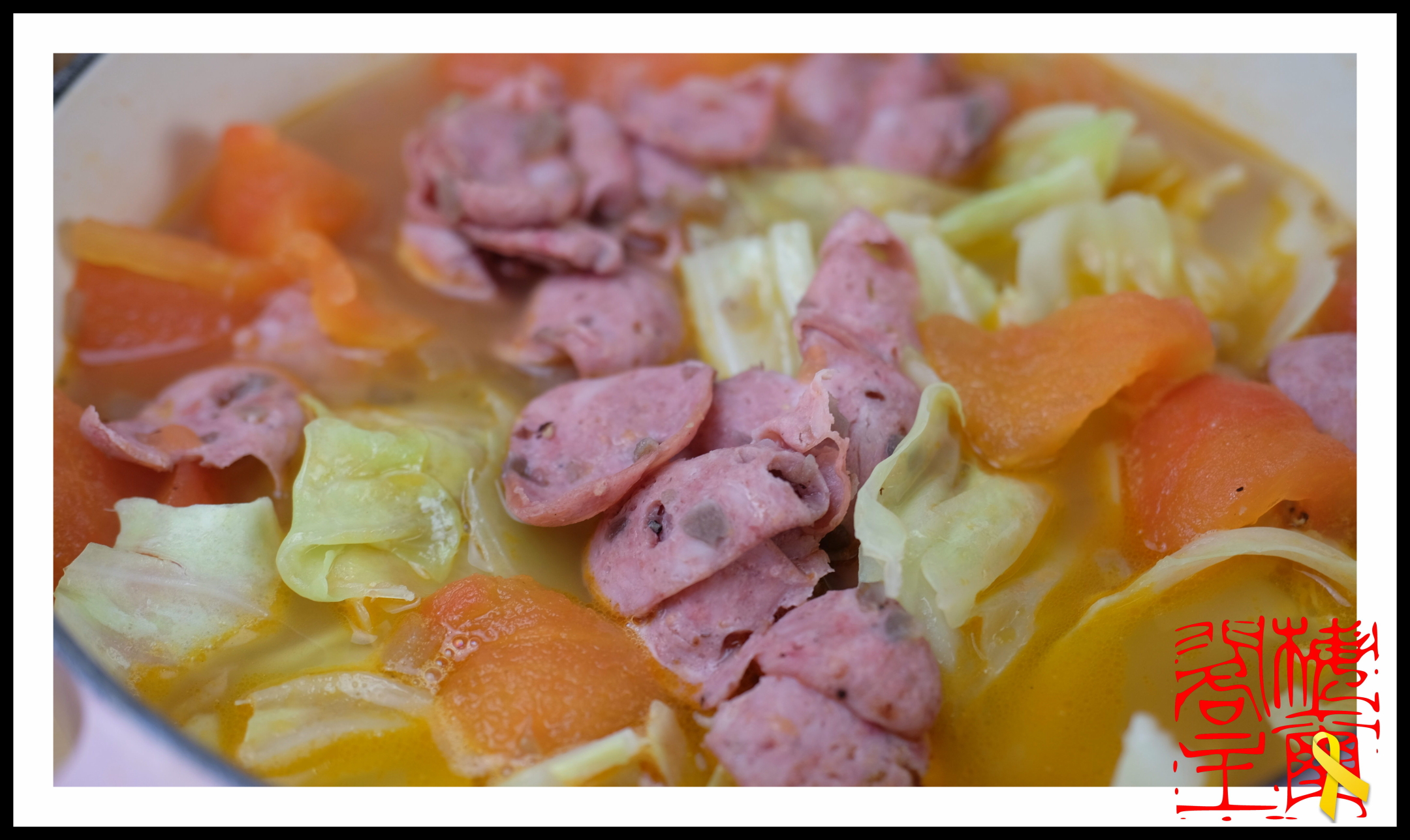 11月11日,夜飯:乾燒明蝦八枚,羅宋湯(捲心菜、番茄五隻、aidells Chicken & Apple Smoked Chicken Sausage 肉腸二根)- 11月11日,中飯:Kirkland Signature All Butter Pound Cake,咖啡