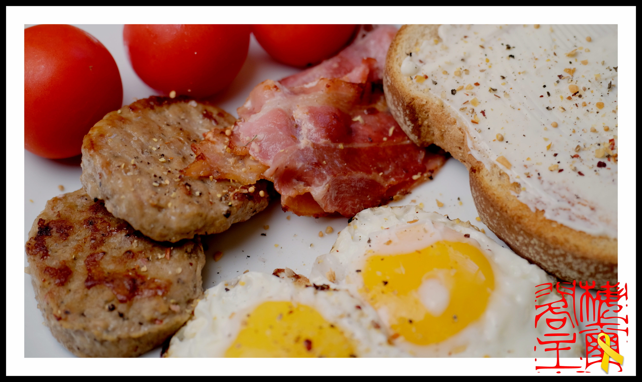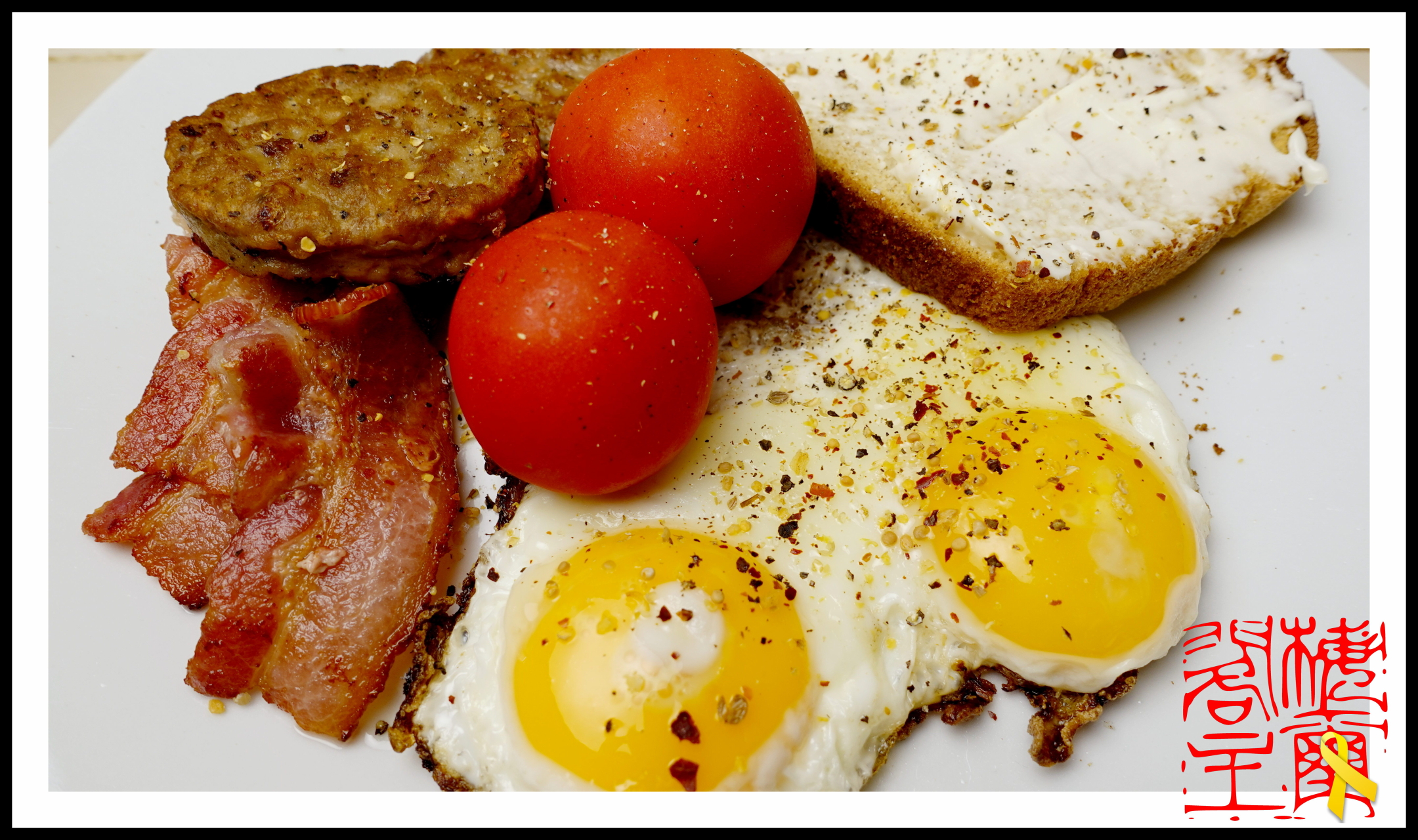 11月29日,早飯:Alfaro’s Artesano Golden Wheat Bakery Bread 麵包塗 Trader Joe’s Brie Cheese Flavored Spread 起司、Kirkland Signature Low-Sodium Bacon 半片培根四枚、Jimmy Dean® All Natural Fully Cooked Pork Sausage Patties 肉餅二枚、煎蛋二枚、Sunset Brands Campari Tomatoes 小番茄三枚