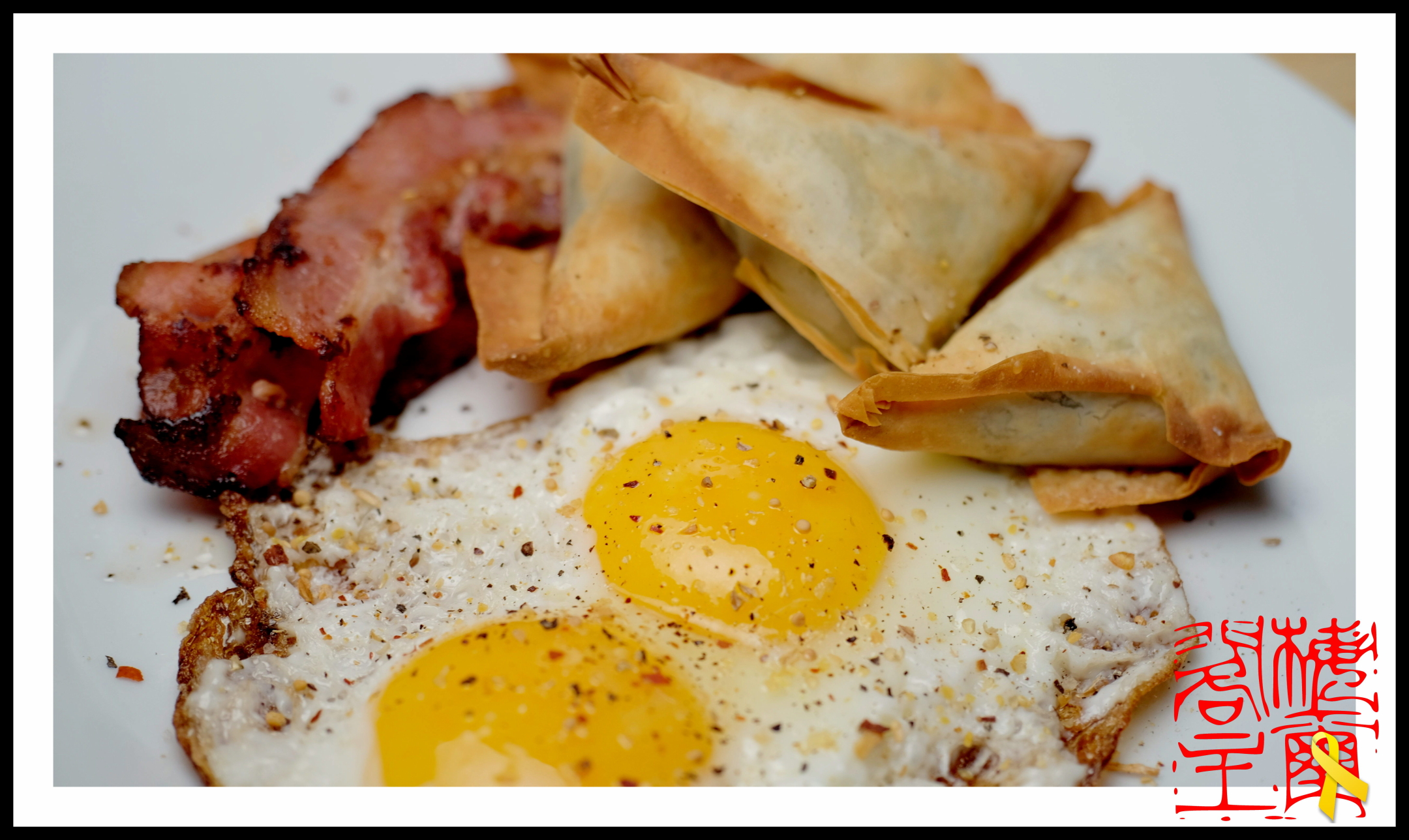 11月23日,早飯:Cuisine Adventures™ Spanakopita Spinach & Feta Phyllo Triangles 起司菠菜角四枚、Kirkland Signature Low-Sodium Bacon 半片培根四枚、煎蛋二枚