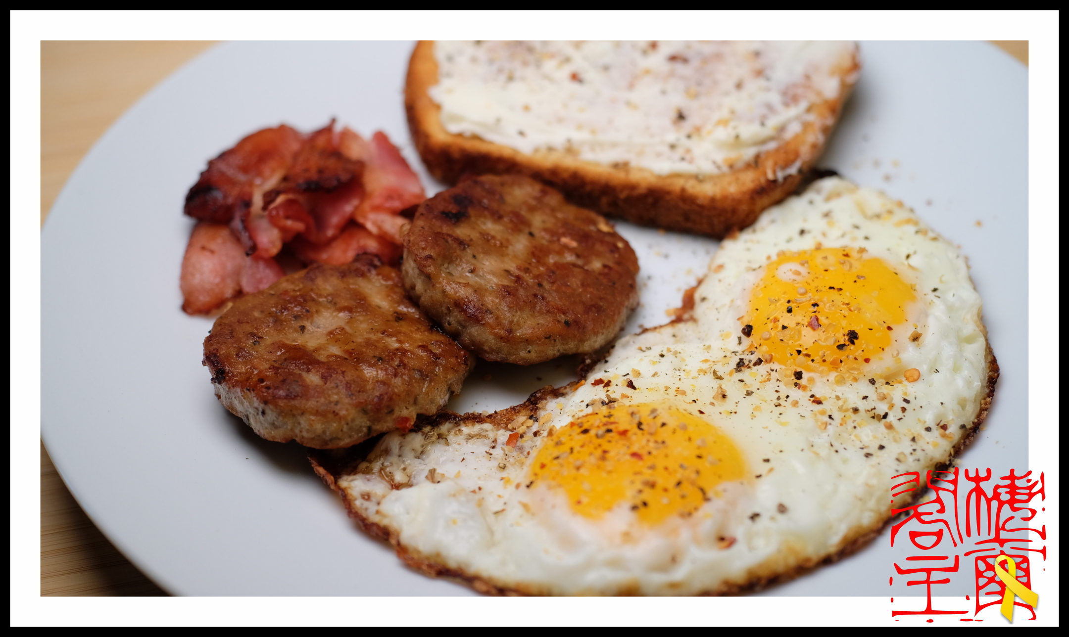 11月21日,早飯:Alfaro’s Artesano Golden Wheat Bakery Bread 麵包塗 Trader Joe’s Brie Cheese Flavored Spread 起司、Jimmy Dean® All Natural Fully Cooked Pork Sausage Patties 肉餅二枚、Kirkland Signature Low-Sodium Bacon 半片培根四枚、煎蛋二枚
