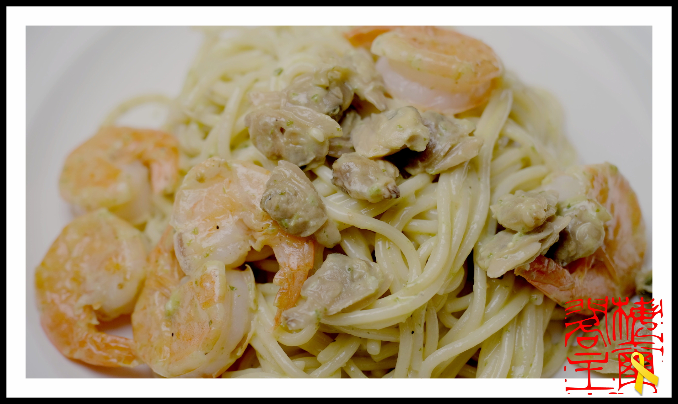 11月26日,夜飯:青醬義麵-Waterfront Bistro Shrimp Raw, Ez Peel Shell & Tail On 十二枚、Kirkland Signature Imported Basil Pesto、(COSTCO)Garofalo Organic Spaghetti Noodles、Kraft Singles American Cheese 起司兩張、蛤蜊肉/2srv