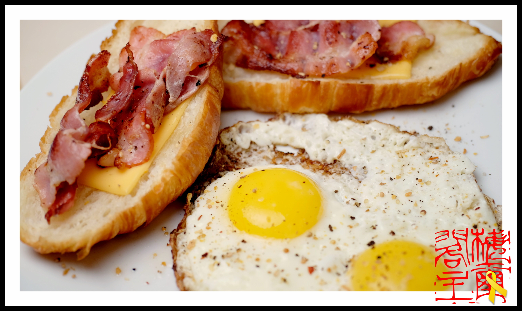 11月30日,早飯:Kirkland Signature Butter Croissants、Kirkland Signature Low-Sodium Bacon 半條培根四枚、Kraft Singles American Cheese 起司一張