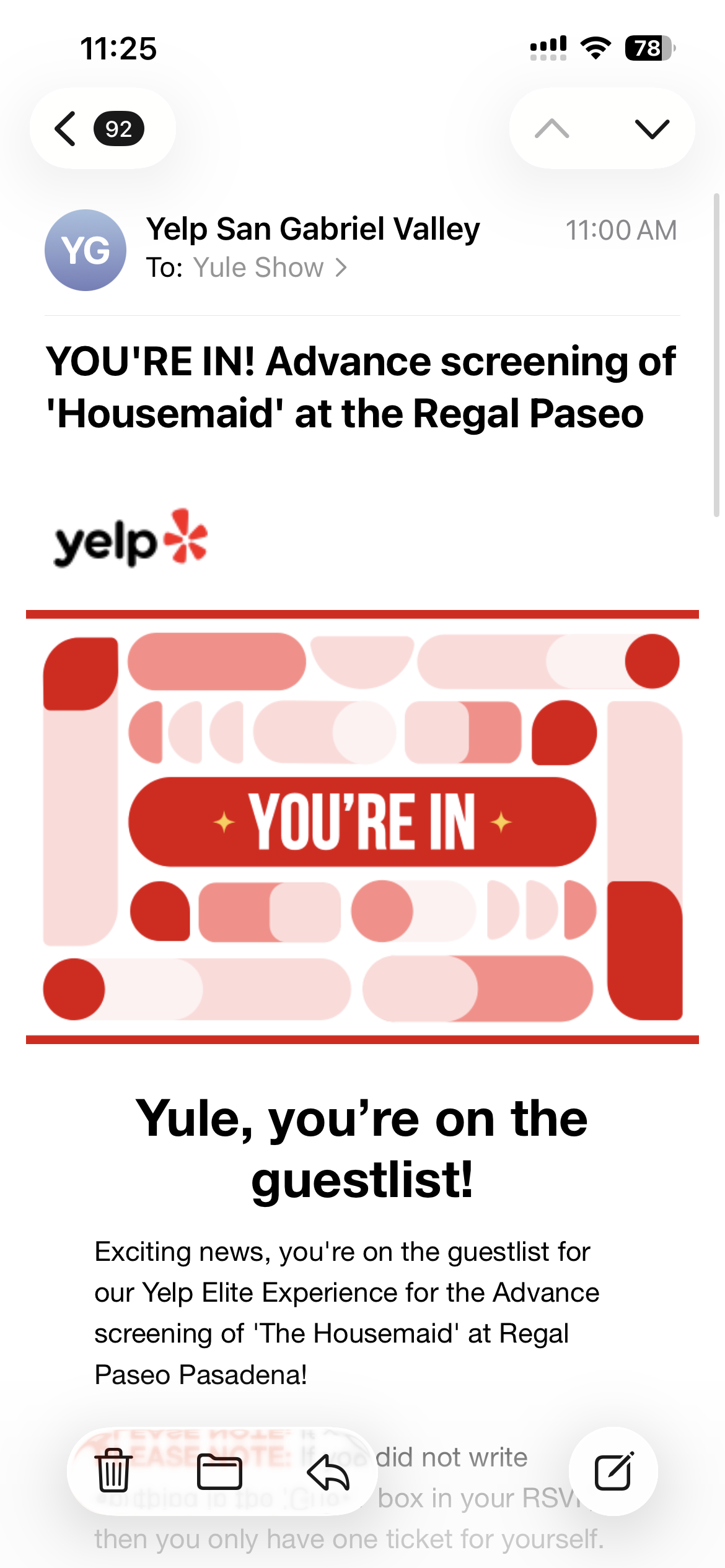 今天,Yelp Elite有一場電影預演點映活動,應該是12月19日上映的《The Homemeid》,今天晚上就可以看到了。