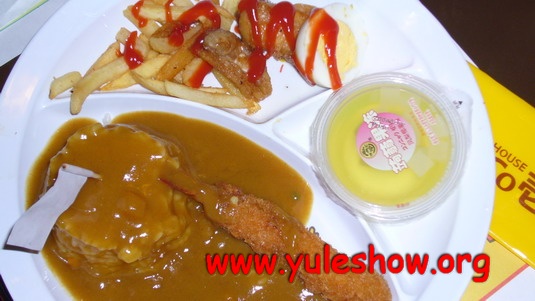 東西很快上來,四大盤飯加「澆頭」,樣子差不多,反正不是很好看的,但是小豆的兒童套餐豐盛得好,不但有飯,有炸蝦,炸雞,還有果凍和上好佳的薯片,不過這些都是小豆最近的「違禁食品」,我本想難得吃一次也無妨,不料小豆自己說「這些東西留著,等我以後病好了再吃。」真的是很乖很乖的小女生哎!