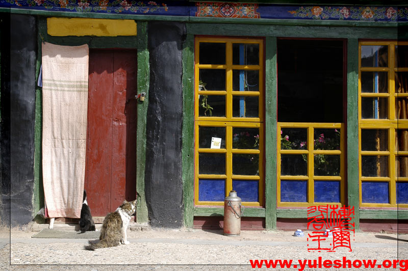 Sam惦記著小豆沒有喫過早飯,硬是要我解決早飯的問題,見到不遠處的一個院子,裡面擺著十幾套桌椅,像是家飯店,便走進院子睢瞧。原來這是個大食堂,院子邊上就是廚房和食堂大廳,食堂的窗口裡,放在一大排放酥油茶的暖瓶,還有一大堆喝酥油茶的那種黃色玻璃杯。窗口裡有個人,我問了一下有什麼喫的,那人聽不懂我的漢語,我也聽不懂他的藏語。