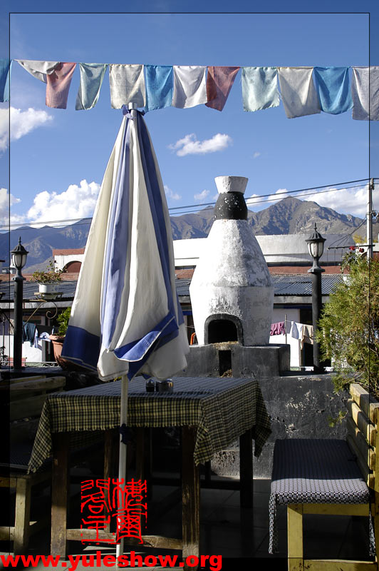 Banakshol Hotel裡就有一個餐廳,一個在屋頂的有頂餐廳(很奇怪的一句話),餐廳的名字很厲害,叫做Namtso Restaurant,Namtso(納木錯)是三大聖湖之一,所以這個餐廳的名字,就叫天湖餐廳。餐廳在Banakshol Hotel的樓頂,一半有頂,一半是露天的,露天的部分有七張長方形的桌子,邊上都插著大大的太陽傘,在這樣的屋頂喝茶,很是寫意的。由於大陽很亮,屋裡在白天不開燈,所以一旦進入,覺得暗暗的,感覺沒有露天的好。在餐廳的邊上,有一塊黑板,上面寫著一些關於募捐的信息,全是英文的,上面的餐廳廣告,也有大量的英文。