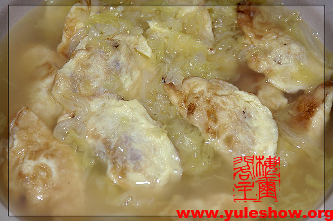 蛋餃做好,不能就喫,因為肉還沒熟,用大火隔水蒸上二十分鐘後,就算成了。蛋餃往往是放在湯裡喫的,然而饞嘴的小朋友多半已經在大人那裡軟磨更纏喫了許多。蛋餃放在雞湯裡最好喫,若是加入黃芽菜絲,吸去油水,更加味美。
