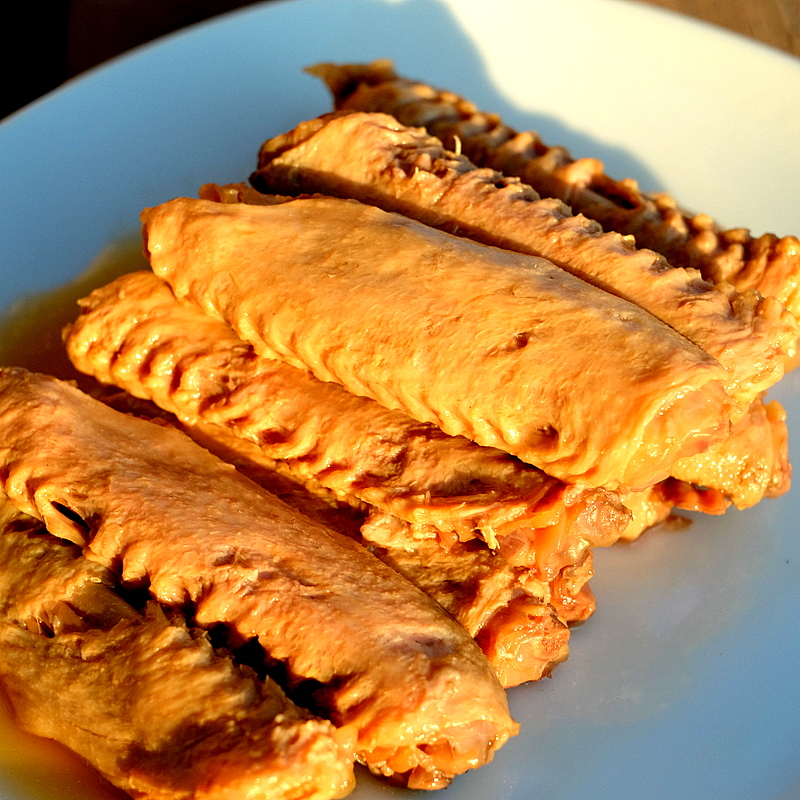 主角是當中那段,最好喫的部分,做滷鴨膀,加陳皮,做陳皮滷鴨膀,找個大鍋,把出過水拔過毛又洗淨的鴨膀放入,加水蓋沒,一條桂皮、三顆茴香、三片香葉、三粒丁香、一小把十來粒花椒、四個乾辣椒,外加一大把蜜餞陳皮,前段時間國內來人帶給我的,很香很甜卻不怎麼酸的陳皮,其實我更喜歡酸一點的陳皮。然後是生抽、鹽、冰糖和糖,一次性所有的香料的調料都加好,然後點火燒,待水沸後轉成中火,燒一個小時左右,我是開著蓋燒的,那是我的習慣,大家要是蓋著鍋蓋,要相對減去一點時間,可能三刻鐘就夠了。