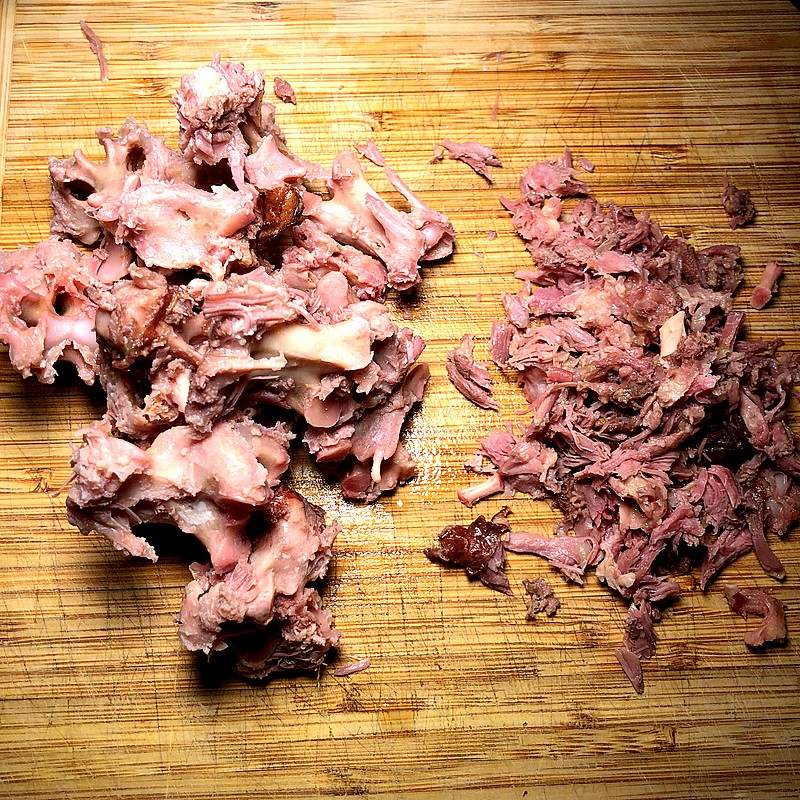 先煮二個小時,把火雞脖從湯裡拿出來,將肉從頸骨上拆下;雖說這個火雞脖沒有皮,但外面被燻硬後,就像是層皮一樣,先扯下,然後裡面的肉稍軟,用刀也好,用叉也好,儘量撕扯下來。這時,不可能把肉和骨分乾淨,把剩下的放回去繼續煮。