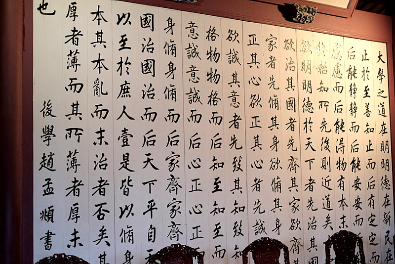 如今,全中國保存得最好的明倫堂,就是臺南孔子廟的明倫堂了。臺南的明倫堂,也頗為奇怪,當中的「明倫堂」匾是乾隆十五年(西元1750年)巡察台灣御史楊開鼎題的,「明倫堂」三字是顏體,倒也不錯,可是上下款根本就沒有體了,真正是小朋友都寫得比這幾個字要好。匾下面,整面牆是趙孟頫所寫《大學》章句,不用說,那是仿寫的,但也仿得太差了。