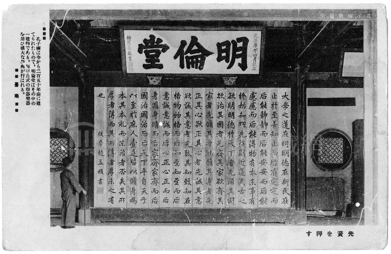 後來,我找到了一張臺灣日佔時期的明信片,是明倫堂的黑白照片,不論是匾還是牆,雖然是一字不差,但是書法明顯要比現在的好多了。明倫堂東西牆上是仿朱熹手書「忠孝節義」四字,倒還看得。